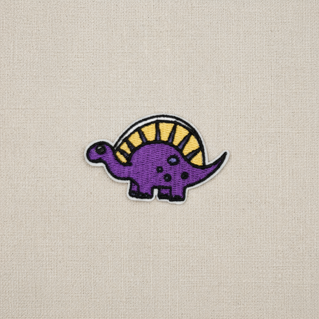 Fargerik og iøynefallende: en kombinasjon av lilla og gul dino som løfter klær og sekk med lekne farger. Enkel stryking for maksimal stil. Strykelapp til klærne.  En rimelig og morsom måte å dekke hull i klærne. Lett å stryke på.