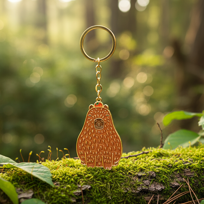 Legg til et gøyalt preg på nøklene eller vesken din med denne emaljenøkkelringen av en søt Capybara med en fersken på hodet.