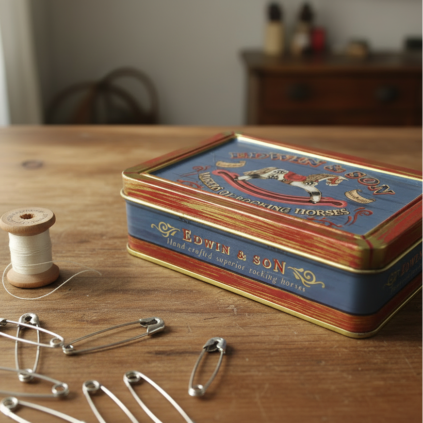 Nostalgisk metallboks til oppbevaring av små skatter, sytilbehør, strykelapper o.l