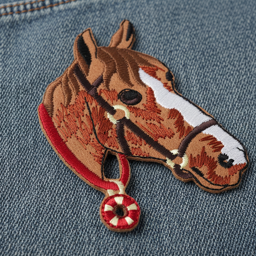 Detaljert og elegant strykemerke med motiv av et hestehode, perfekt for å dekorere eller reparere klær og tekstiler. Dette merket festes enkelt med strykejern og gir et unikt, personlig preg på jakker, vesker, ryggsekker eller andre tekstiler. Ideell for hesteentusiaster eller som et stilig dekorativt element.